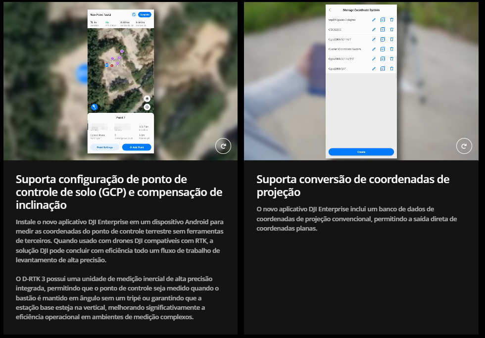 A nova Estação Multifuncional D-RTK 3 integra antenas de alto desempenho e módulos receptores, capazes de rastrear e resolver dados dos principais sistemas globais de navegação por satélite. Ela suporta múltiplos links de transmissão de dados e pode analisar a posição e a orientação do dispositivo por meio de sua unidade de medição inercial de alto desempenho integrada. Com esses recursos excepcionais, ela pode servir como uma estação base para fornecer posicionamento em nível centimétrico para vários drones simultaneamente ou estender o alcance operacional dos drones no modo estação retransmissora. Além disso, o novo modo estação rover, combinado com o aplicativo DJI ENTERPRISE e o DJI Terra, oferece uma solução completa para aplicações de levantamento aéreo de alta precisão.