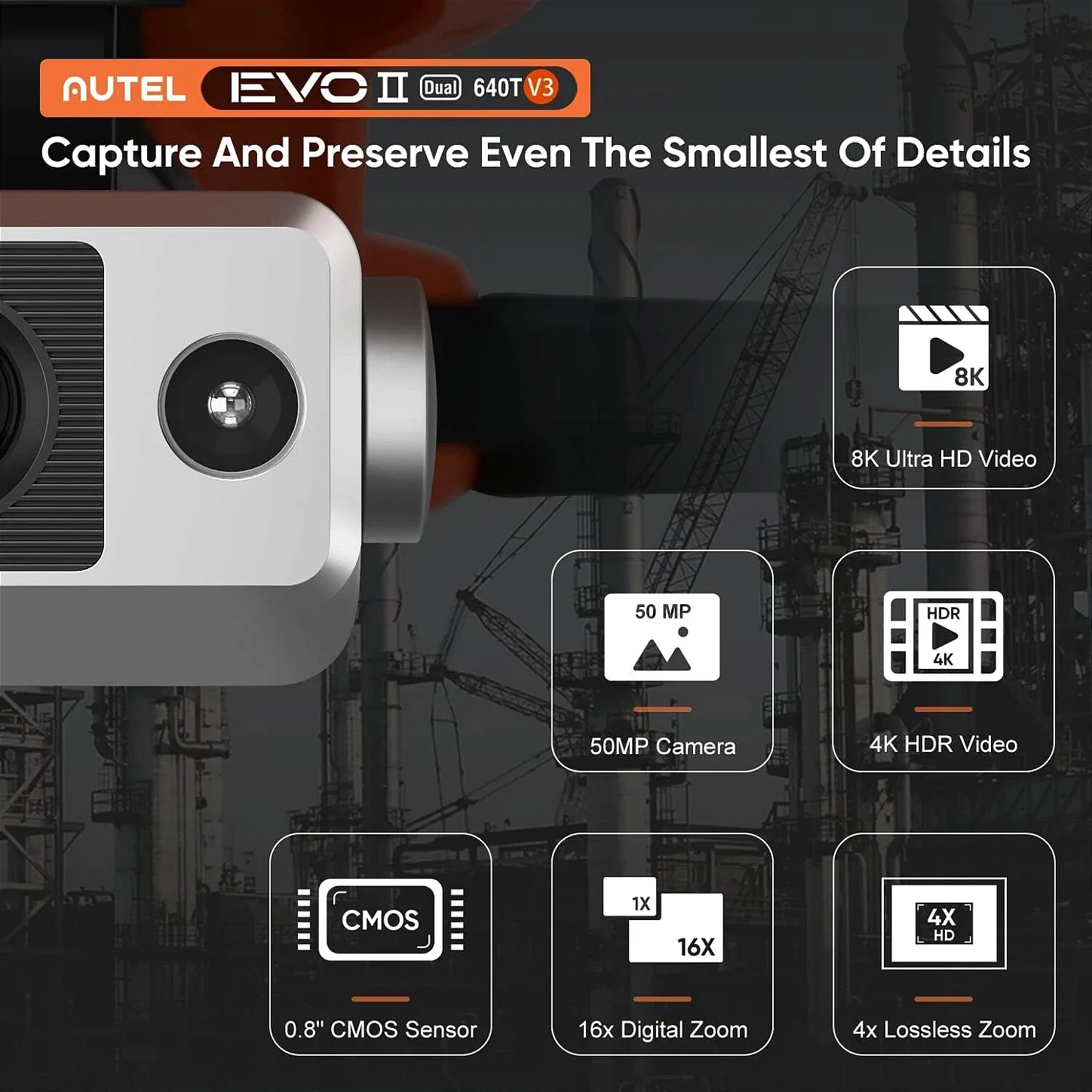 Equipado com um sensor CMOS de 0.8" e câmera de50MP, o drone Autel 640T V3 oferece zoom sem perda de 4x e zoom digital de 16x. Com desempenho de câmera digital impressionante, o EVO II Dual 640T V3 ajuda a capturar cada detalhe para auxiliar na coleta precisa de evidências.
